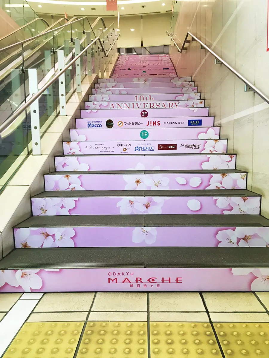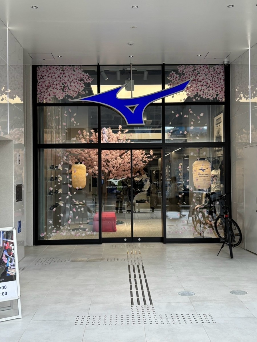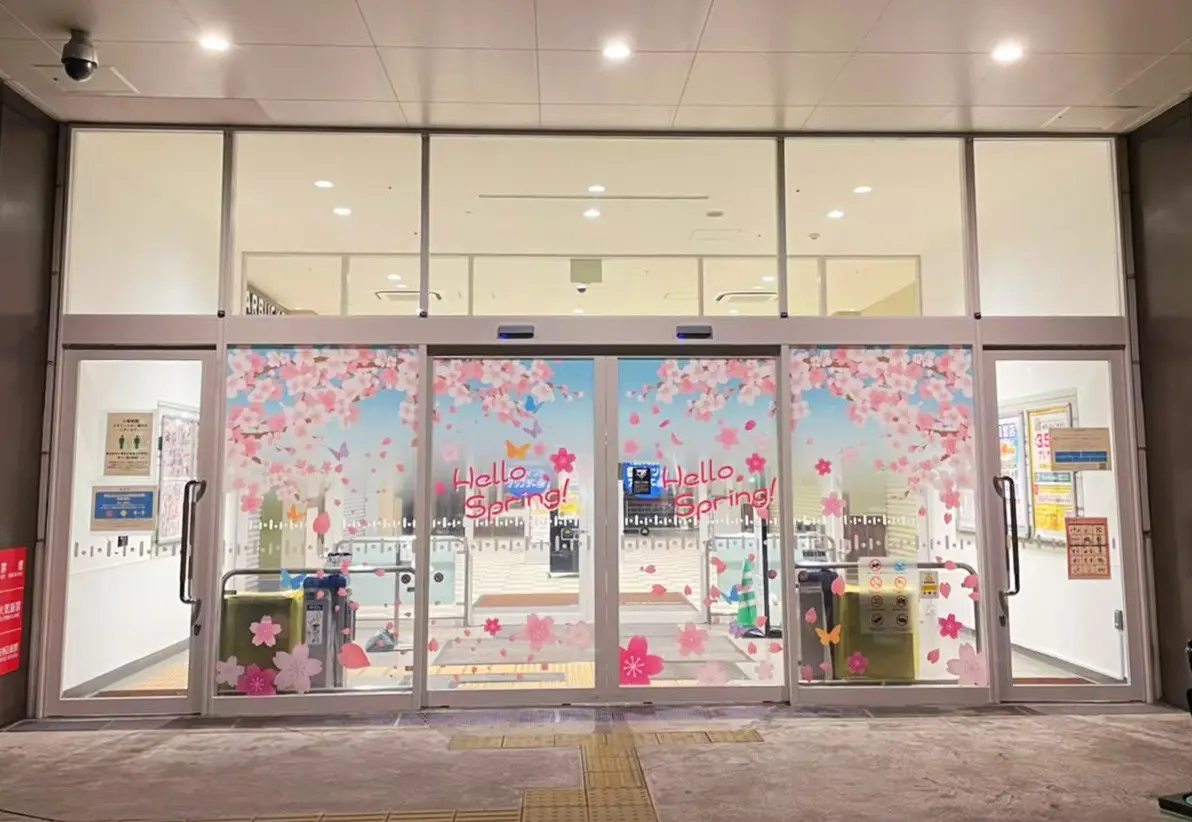 シート装飾は、ガラス面や壁面、床面に桜のデザインを施し、手軽に空間を華やかに彩る装飾方法です。