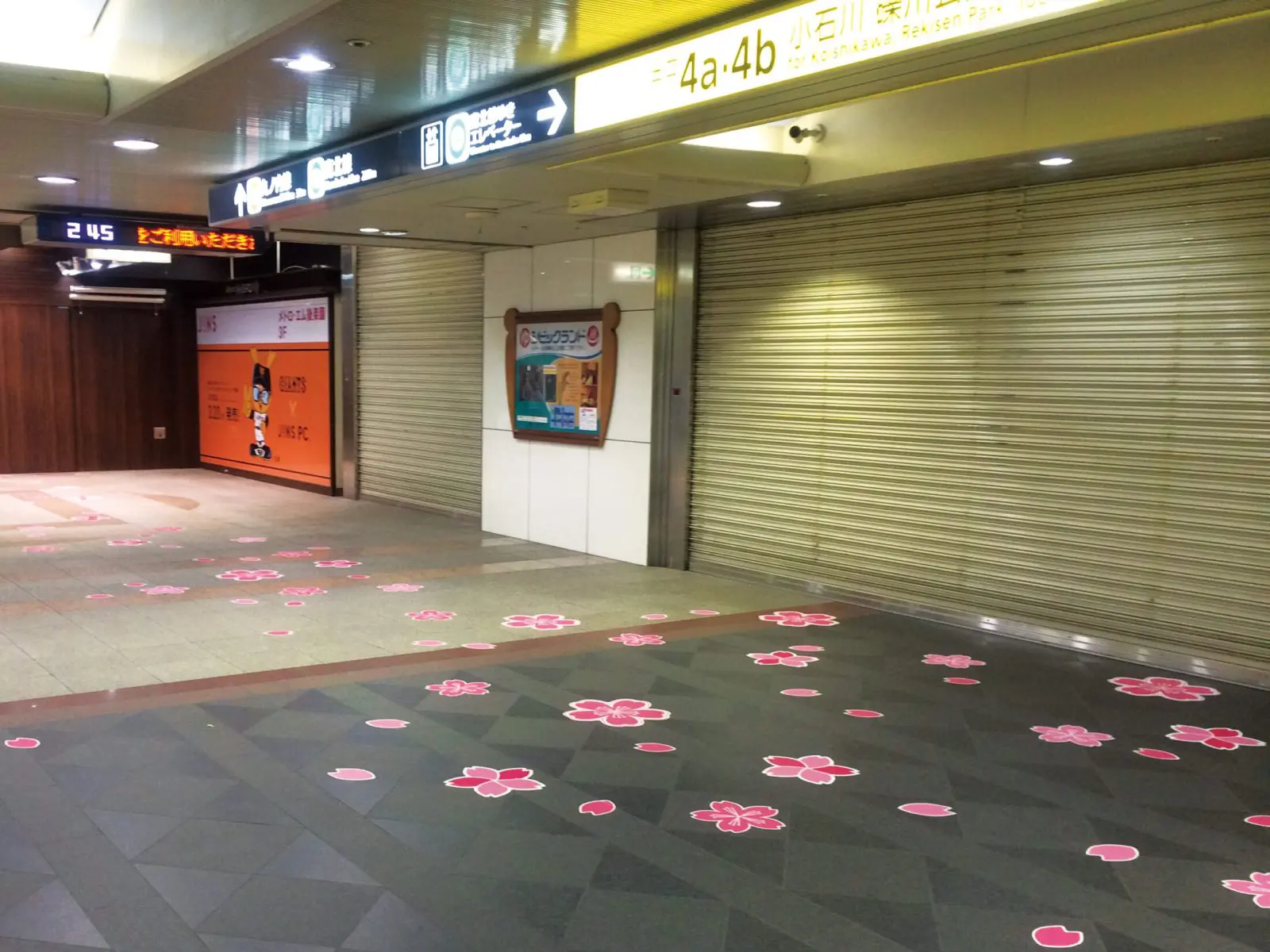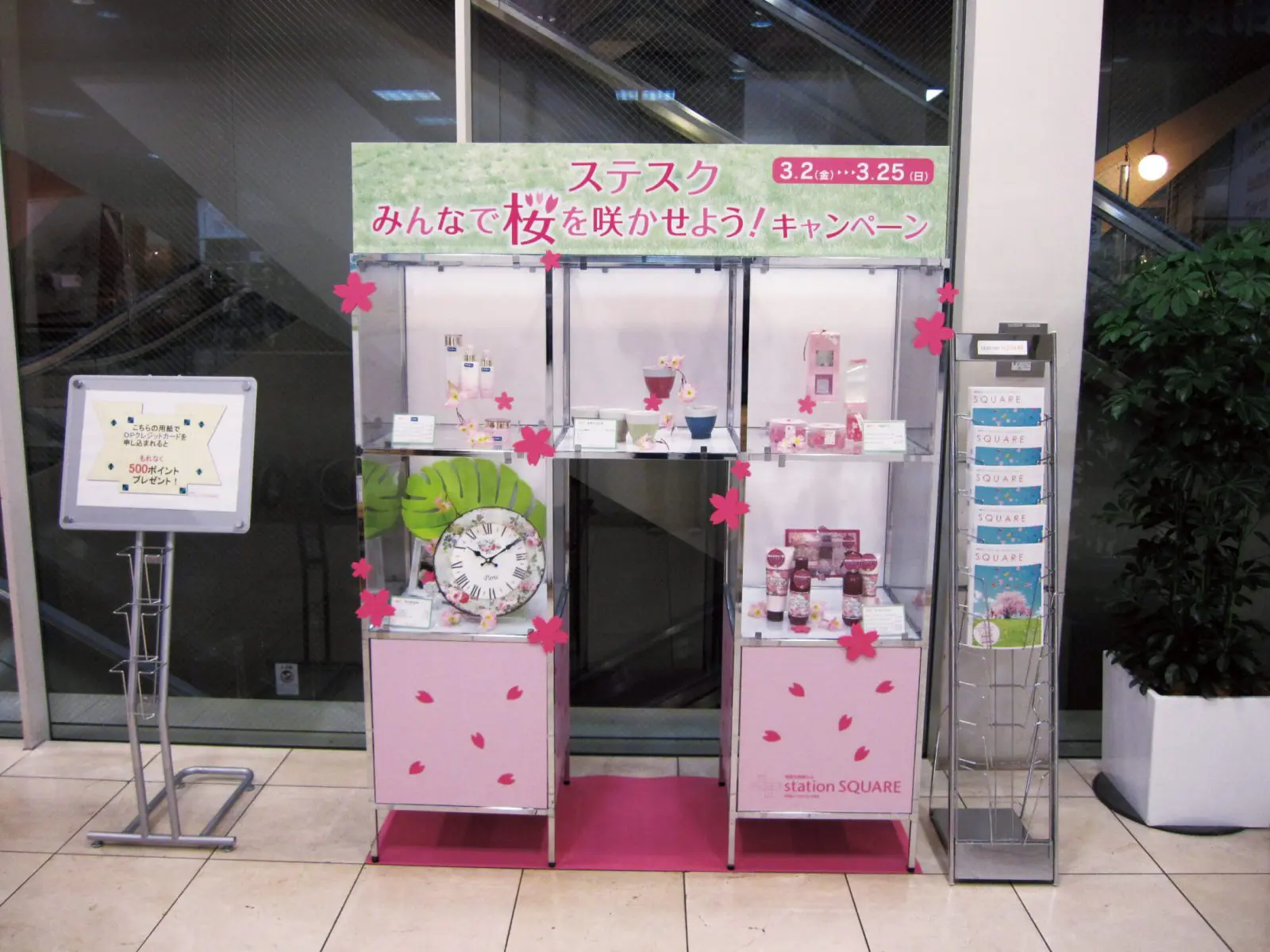 シート装飾は、ガラス面や壁面、床面に桜のデザインを施し、手軽に空間を華やかに彩る装飾方法です。